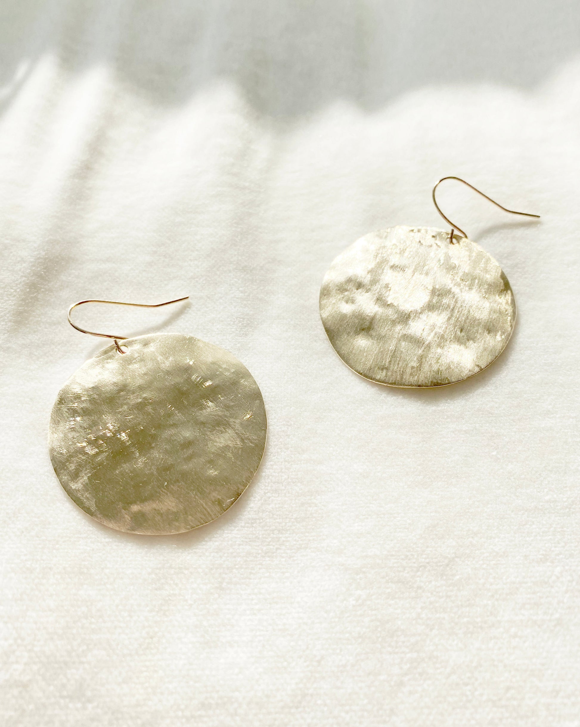 Shining as brightly as the big sun herself, the S O L A R I S golden sun earrings are cut, formed, textured and finished completely by hand, out of reclaimed and sustainable brass using traditional methods and old family tools passed down the generations. They have a lovely natural beaten and then brushed texture, and delicate organic appearance with a slightly convex shape to them. The idea is that they are supposed to look like they've washed up on an island in the Aegean Sea.